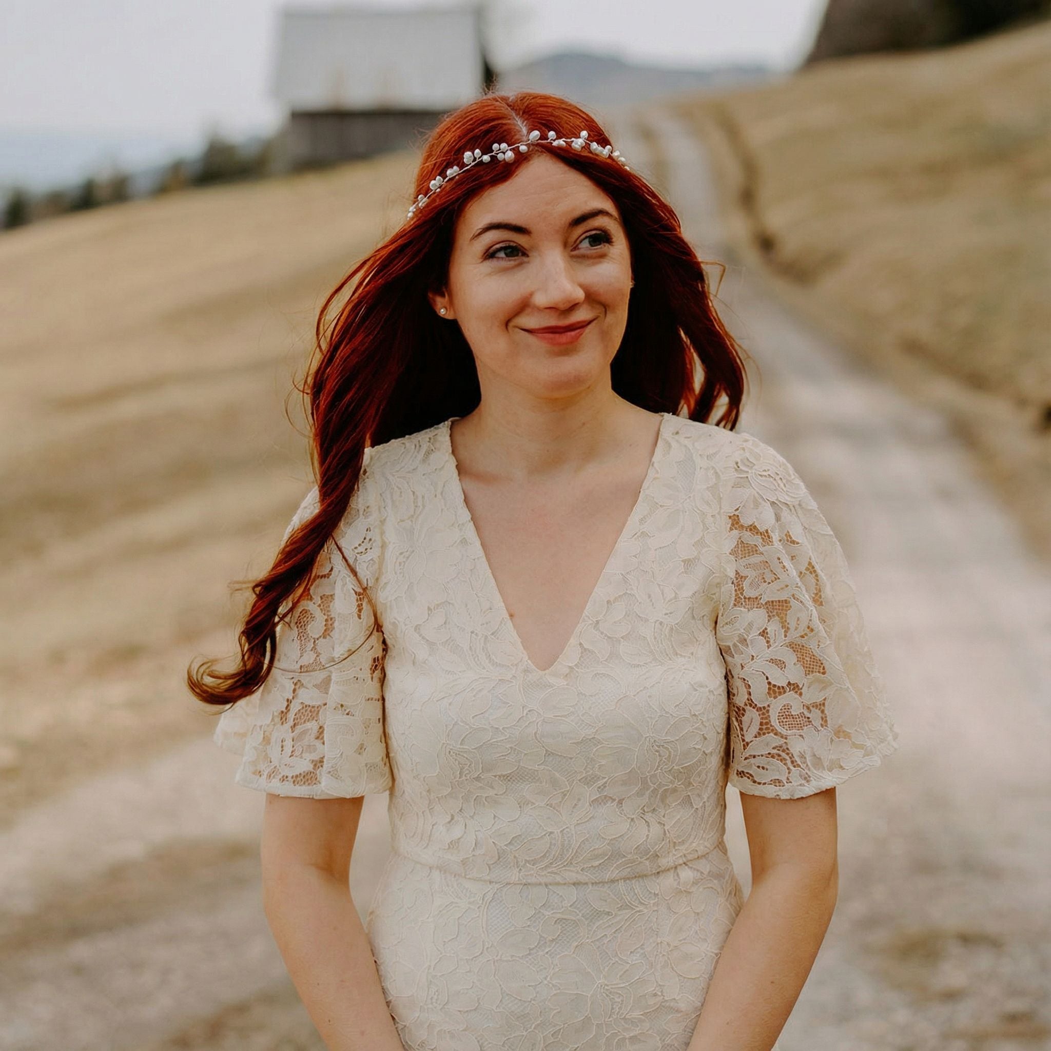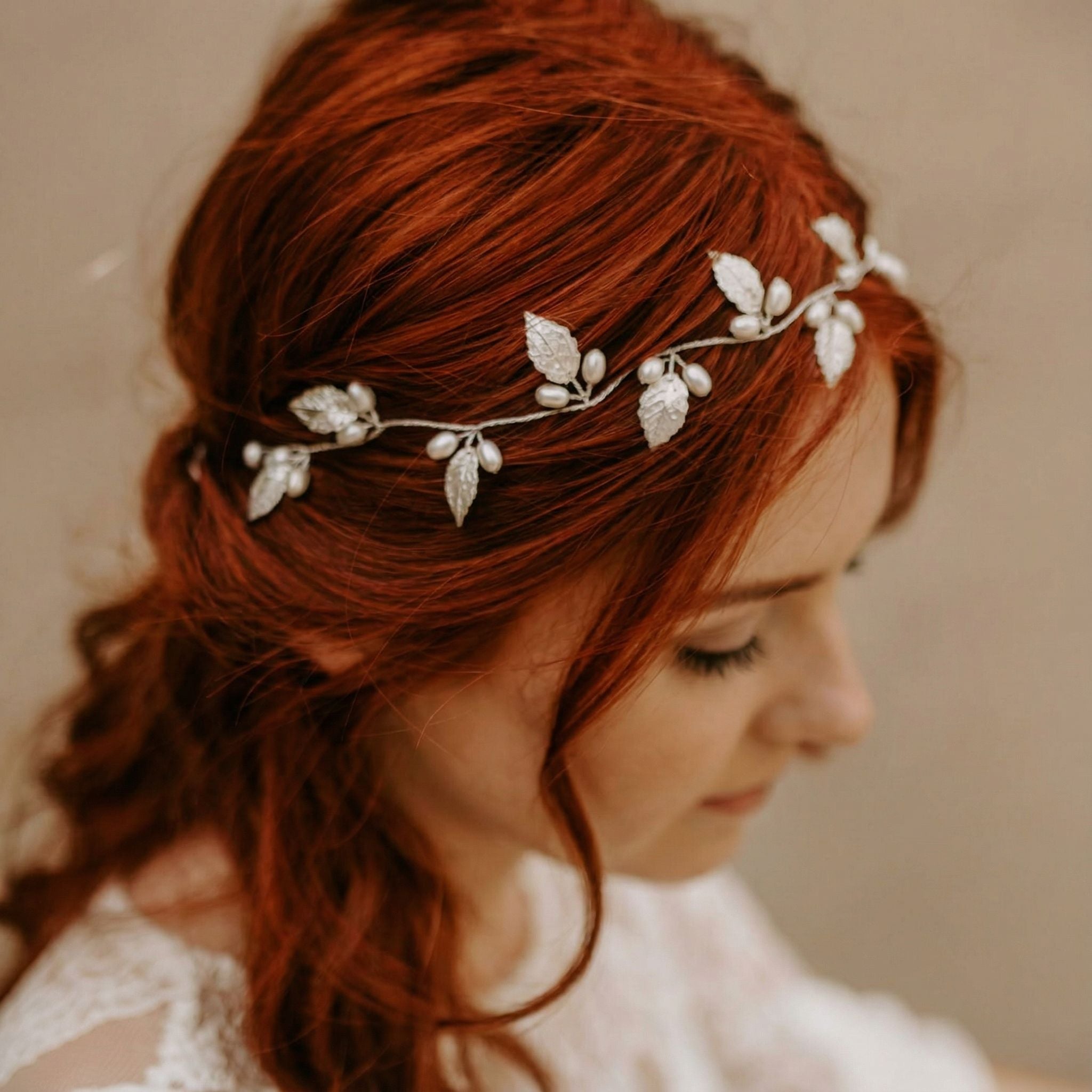 Die Accessoires für rothaarige Bräute sind entscheidend für die Gesamtwirkung deines Looks. Goldschmuck ist die ideale Kombination. Warme Goldtöne und Kupfer-Nuancen harmonieren perfekt mit der natürlichen Wärme roter Haare. Haarspangen, Haarkämme oder Diademe in Gold oder Roségold setzen elegante Akzente. Sie konkurrieren nicht mit der Haarfarbe. Auch Perlen sind eine wunderbare Wahl. Besonders cremefarbene oder champagnerfarbene Perlen schimmern sanft und veredeln die Frisur.