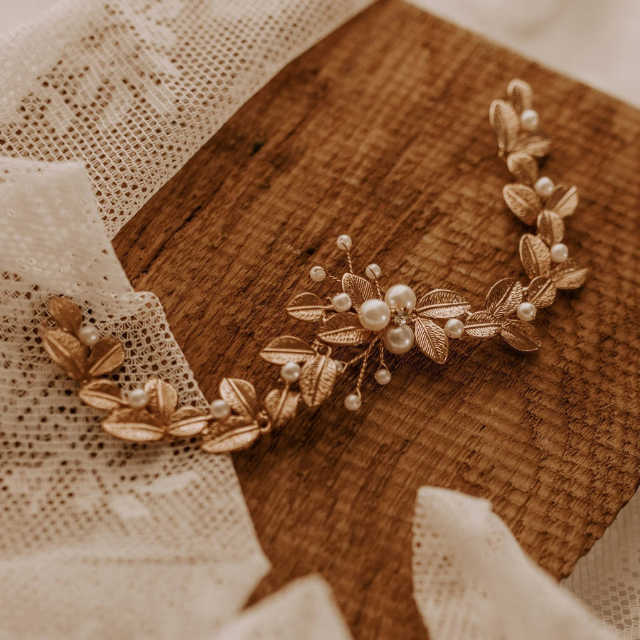 Ein romantisches Statement für deine Brautfrisur. Hier findest du für deine Hochzeit dein Vintage Headpiece, handgeflochten aus hochwertigem Metalldraht mit Perlen und Blätter Verzierung. Ein atemberaubender Akzent in deiner Hochzeitsfrisur, mit einer natürlichen Leichtigkeit. Der Kopfschmuck ist durch die Handverdrahtung flexibel und kann von dir in deine Wunschpassform geformt werden.weiße Perlen, Metalldraht